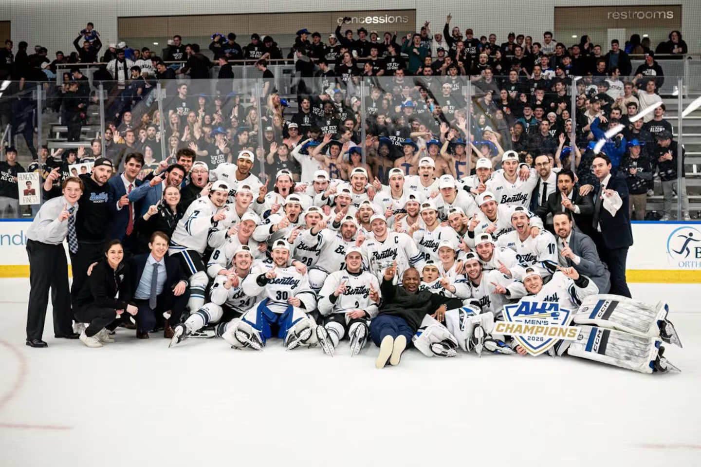 Image Credit: Boston Globe | Bentley celebrates its second-straight AHA tournament championship on home ice with a rowdy student section behind the team.