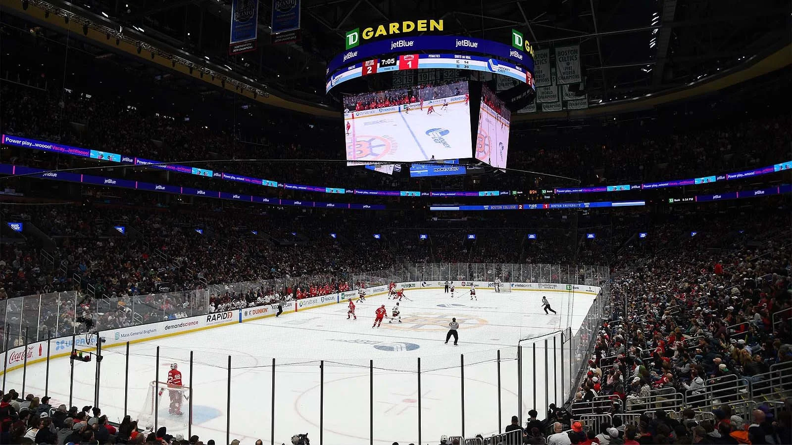 The gameday production during the event reflects Hockey East’s decision to hold it at a neutral site. Both teams’ introduction videos are played before the lineups are announced and the crew uses the effects for the Bruins after each team scores.