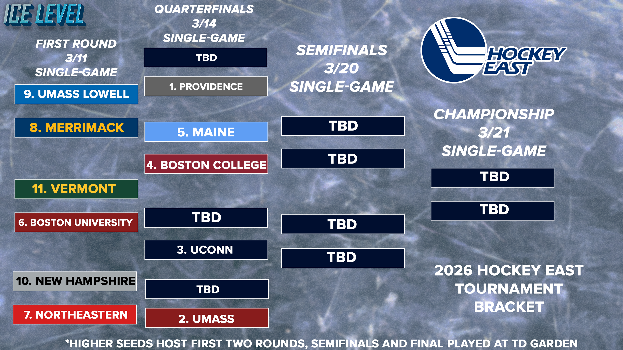 The chase to Boston begins with the opening round on Wednesday. Vermont highlights the round with a chance to upset Boston University at Agganis Arena. Reigning champions Maine and Boston College meet at Conte Forum for the quarterfinals in the only set matchup. Saturday sees Providence, UMass and UConn taking on the lowest, second and third-lowest seeds respectively on Saturday. The back-to-back semifinal and final rounds at TD Garden happen next weekend with teams set to meet Wednesday, Friday and Saturday.